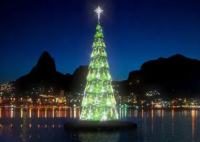 Na Enseada de Botafogo, a primeira edição do projeto Natal do Rio transforma um dos cenários mais emblemáticos da cidade em espaço de celebração, cultura e encontros. A árvore flutuante de 80 metros de altura, iluminada por mais de 2,3 milhões de luzes de LED, idealizado com direção criativa de Abel Gomes (SRCOM) e realização da Accioly Participações. Além do palco principal, no espaço tem a Vila Gastronômica, que reúne diversas operações gastronômicas em formato de food trucks, com curadoria de Ana e Pedro Vidal, além de ativações de marcas parceiras e experiências pensadas para todas as idades. Inaugurada no dia 29 de novembro, vai ficar até 06 de janeiro, com programação cultural gratuita distribuída ao longo dos finais de semana, incluindo apresentações musicais, espetáculos de luzes, ballet de águas e atividades voltadas para famílias e crianças, com expectativa de que o projeto receba mais de 650 mil visitantes até o fim da temporada.