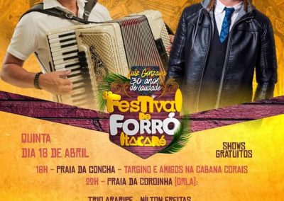 A programação já está definida. No dia 18 de abril a festa começa às 18 horas na Praia da Concha com Targino e Amigos na Cabana Corais. E a partir das 22 horas a festa passa a ser na Praia da Coroinha, com Trio Araripe, Targino Gondin, Tato do Fala Mansa, Nilton Freitas, Forró do Ralçao e Nenén do Acordeon.
