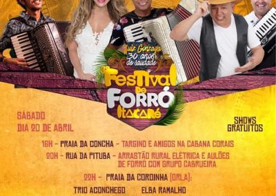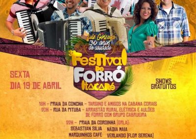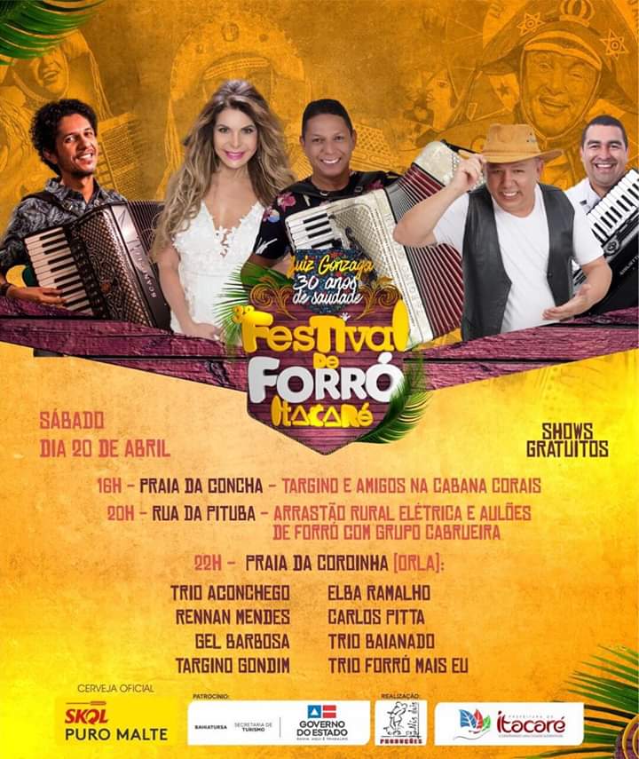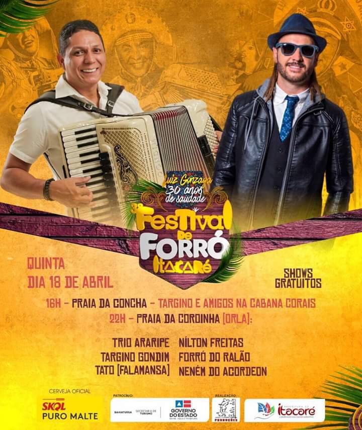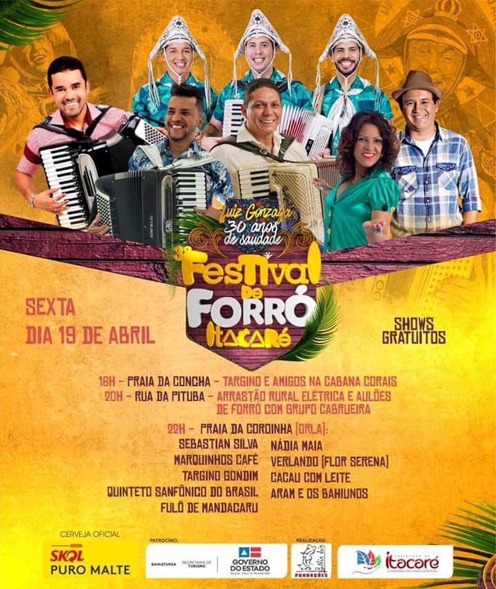 Grandes atrações nacionais vão estar em Itacaré litoral sul da Bahia no 3° Festival de Forró, que acontecerá de 18 a 20 de abril de 2019 na Praia da Concha, Rua da Pituba e na Praia da Coroinha, na orla da cidade. Os shows acontecerão em praça pública e terá atrações como Targino Gondim, Elba Ramalho, Estakazero, Tato do Falamansa, Fulô de mandacaru, Quinteto Sanfônico do