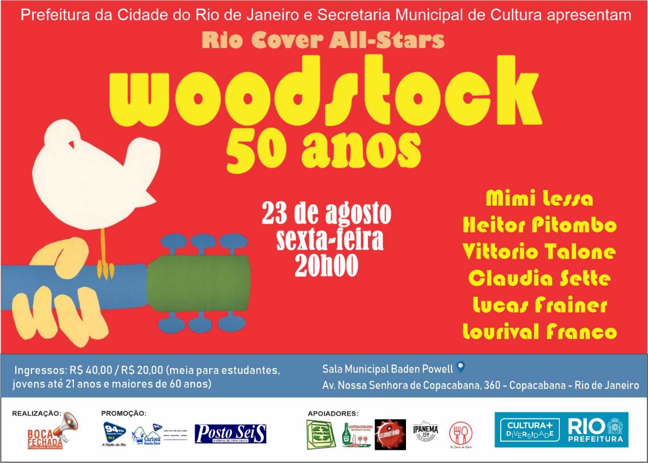 Orgulhosamente, o produtor João Luiz Azevedo apresenta o show WOODSTOCK 50 ANOS com a banda RIO COVER ALL-STARS formada pelos músicos Mimi Lessa (guitarra), Heitor Pitombo (baixo, violão, voz), Vittório Tolone (guitarra, violão, voz), Lucas Frainer (bateria), Lourival Franco (teclados) e Cláudia Sette (voz), na Sala Municipal Baden Powell (Av. Nossa Senhora de Copacabana 360) em única apresentação, no dia 23 de agosto/2019, sexta feira, as 20h, com ingressos ao preço de R$ 50,00 / R$ 25,00 (estudantes, jovens até 21 anos e acima de 60 anos).